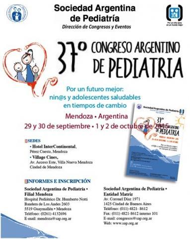 Mendoza ha sido designada como sede del 37° Congreso Argentino de Pediatría, a realizarse los días 29, 30 de setiembre, 1 y 2 de octubre de 2015.