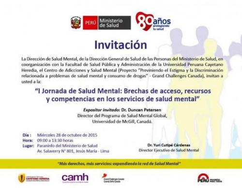 La Dirección de Salud Mental del Ministerio de Salud (MINSA) y la Facultad de Salud Pública y Administración (FASPA) de la Universidad Peruana Cayetano Heredia (UPCH), desde hace varios años vienen realizando actividades conjuntas relacionadas a la sensibilización y capacitación de profesionales, especialmente de salud, con la finalidad de fortalecer sus competencias para la atención, desarrollo de la investigación y formulación de políticas en salud mental.