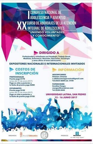 I Congreso Nacional de Adolescencia y Juventud / XX Curso de Abordajes en la Atención Integral a Adolescentes. "Uniendo Voluntades y Conocimiento " 13 al 16 de Junio 2017 Universidad Latina San Pedro. San José. Costa Rica