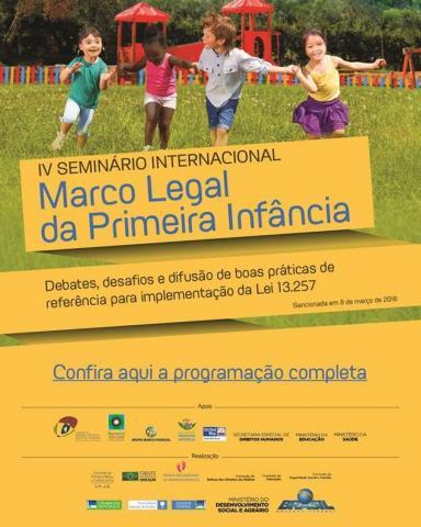 O IV Seminário Internacional do Marco Legal da Primeira Infância é uma iniciativa conjunta da Câmara dos Deputados (Frente Parlamentar Mista da Primeira Infância, Frente Parlamentar da Educação, Comissões de Defesa dos Direitos da Mulher; Educação; Seguridade Social e Família), do Senado Federal (Comissão de Valorização da Primeira Infância e Cultura da Paz e Procuradoria Especial da Mulher) e do Ministério de Desenvolvimento Social e Agrário. Este evento sucede três edições anteriores de Seminários Internacionais com apresentações e debates que ensejaram a proposição e aperfeiçoamento do Marco Legal da Primeira Infância, recentemente sancionado como Lei Federal no 13.257/2016. Esta nova legislação institui a Política Integrada da Primeira Infância, visando à atuação intersetorial e multiprofissional para promoção do desenvolvimento humano a partir da atenção às crianças de até seis anos de idade.