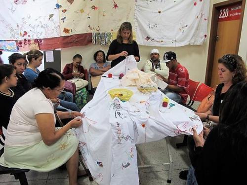 O projeto Arte na Espera constitui uma das atividades do Núcleo de Saúde do Adolescente do Hospital das Clínicas da Universidade Federal de Minas Gerais (HC-UFMG) em parceria com o Instituto Undió. A construção da interface entre arte e saúde propicia um acolhimento vivo dos adolescentes, familiares e acompanhantes, que se apropriam desse espaço e estabelecem uma interlocução com a equipe interdisciplinar. Essa equipe tece a construção do caso clínico: os saberes se entrelaçam, mas não se completam; um espaço central é o do saber do próprio adolescente, especialista de si mesmo. Observa-se que os adolescentes, que muitas vezes se encontravam sem lugar, encontram no projeto um referencial. Alguns, a partir desse ponto, tecem laços mais amplos na cidade. Os familiares e acompanhantes podem expressar suas próprias questões no convívio com os pares e profissionais em torno da mesa do bordado, do café, da poesia. Os alunos da Graduação e da Pós-graduação aprendem muito sobre o acolhimento e sobre a construção de uma prática clínica viva e interdisciplinar.