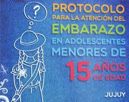 http://www.codajic.org/node/3046 Nuevo Protocolo para la atención del embarazo adolescente en menores de 15 años. Autores: Dirección General de Maternidad e Infancia Secretaría de Planificación en Políticas y Regulación Sanitaria. Ministerio de Salud de la Provincia de Jujuy. UNICEF Argentina. 2017