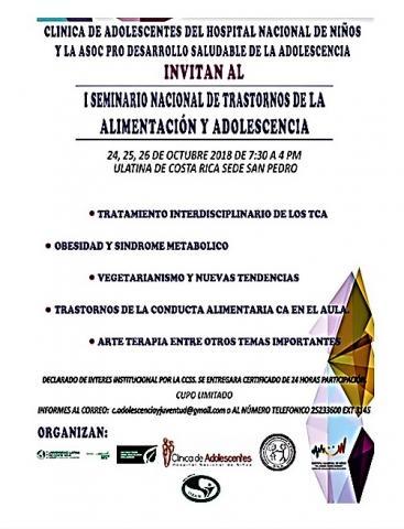 I Seminario de trastornos de la conducta alimentaria y adolescencia- Clínica de Adolescentes del Hospital Nacional de Niños - Asociación Pro Desarrollo Saludable de la Adolescencia 24 al 26 de Octubre de 2018 .U Latina San Pedro. San José . Costa Rica