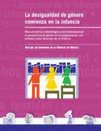 http://www.codajic.org/node/3972 La desigualdad de género comienza en la infancia . Manual teórico-metodológico para transversalizar la perspectiva de género en la programación con enfoque sobre Derechos de la Infancia Autora: Alma Rosa Colín Colín. Red por los Derechos de la Infancia en México (Derechos Infancia México AC) Esta publicación busca visibilizar la situación de las niñas y las adolescentes en México, especialmente de los grupos altamente discriminados donde las diferencias de género, edad y situación económica suelen ser un factor que reduce, aún más, las posibilidades de desarrollo. Al mismo tiempo brinda elementos para fortalecer la perspectiva de género en el trabajo a favor de los derechos de la infancia con el fin de que organizaciones e instituciones adquieran paulatinamente nuevas formas de trabajo en las que se considere la equidad de género dentro de sus planes, programas, proyectos y presupuesto.