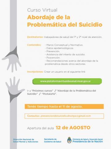 Argentina .Curso virtual Gratuito de abordaje de la problemática del suicidio . Inscripción hasta el 11.08.19