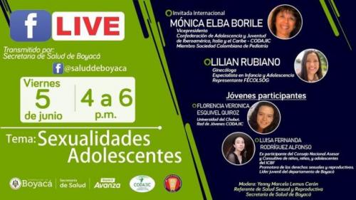 http://www.codajic.org/node/4482 Conversatorio: Sexualidades Adolescentes Secretaría de Salud de Boyacá Junio 2020 Tunja, 5 de junio de 2020. (UACP). Con el apoyo de la Confederación de Adolescencia y Juventud de Iberoamérica, Italia y el Caribe, CODAJIC y la Federación Colombiana de Obstetricia y Ginecología, FECOLSOC, la Secretaría de Salud de Boyacá llevará a cabo el conversatorio virtual ‘Sexualidades adolescentes’, este viernes 5 de junio, a las 4:00 p.m., a través de Facebook Live, desde la Fanpage de la Secretaría.El objetivo es propiciar un espacio a través del cual la vicepresidenta de CODAJIC, Mónica Elba Borile y la ginecóloga, especialista en Infancia y Adolescencia, Lilian Rubiano, expertas en el abordaje integral de la adolescencia y anticoncepción, puedan socializar sus experiencias exitosas en el trabajo con adolescentes y responder dudas e inquietudes a la comunidad, identificando los imaginarios sociales frente a la sexualidad y fortaleciendo la estructura de una sexualidad responsable, basada en los derechos sexuales y reproductivos y la toma de decisiones asertivas. De igual manera, participarán dos jóvenes lideresas y promotoras de los derechos sexuales y reproductivos, Luisa Rodriguez Boyaca Colombia Florencia Esquivel Red Joven CODAJIC - Universidad del Chubut Argentina quienes compartirán a través de su voz, la opinión de los adolescentes y jóvenes frente a las necesidades de acompañamiento, especialmente en estos momentos de confinamiento. De acuerdo con la referente de Salud Sexual y Reproductiva, Yenny Marcela Lemus Cerón, quien será la moderadora del conversatorio, con estas acciones se busca promover la salud sexual y reproductiva de los adolescentes y jóvenes, desde la Política Nacional de Sexualidad Derechos Sexuales y Derechos Reproductivos, y la estrategia de prevención del embarazo temprano.