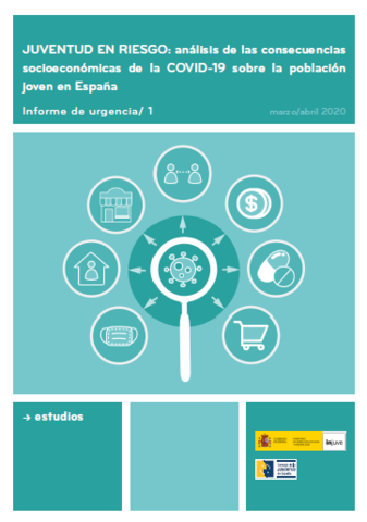 http://www.codajic.org/node/4527 Juventud en riesgo: análisis de las consecuencias socioeconómicas de la COVID-19 sobre la población joven en España Autor: Instituto de la Juventud y Consejo de la Juventud de España Primer informe. Abril, 2020 Con el objetivo de evaluar de forma urgente el impacto que la crisis sanitaria de la COVID-19 está teniendo sobre las posibilidades económicas, laborales y de emancipación de la juventud española, el Instituto de la Juventud (Injuve) y el Consejo de la Juventud de España (CJE) han unido sus fuerzas para elaborar este estudio. Este estudio contará con dos entregas, la primera dedicada a las primeras consecuencias socioeconómicas que el confinamiento obligado por la COVID-19 ha tenido sobre la población joven, y una segunda que evaluará la situación post-pandemia y el crecimiento perdido, en términos relativos, entre las expectativas y la realidad del segundo semestre de 2020.Este primer informe de la serie constituye, a partir de la información actualmente disponible, un primer intento para evaluar el impacto que está teniendo el actual estado de alarma en la situación laboral de la población joven (16-29 años) de España.
