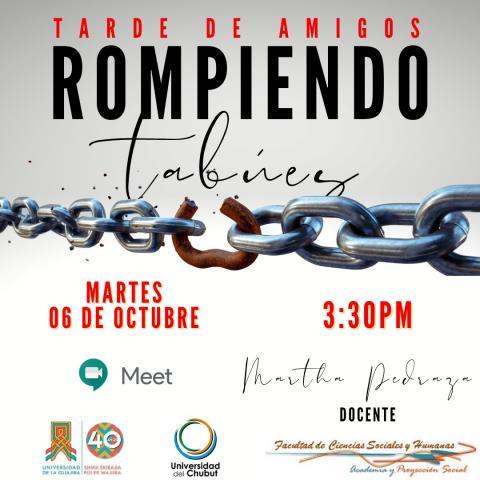 Tarde de amigos/as Rompiendo tabúes : Martes 6 de Octubre de 2020 . 15, 30 hs de Colombia . Clase Espejo Catedra Electiva Sexualidad y Género, Universidad de La Guajira / Universidad del Chubut/ Universidad de Santander