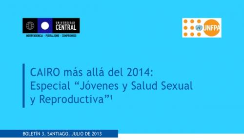 El Boletín “Cairo más allá del 2014: Especial Jóvenes y Salud Sexual y Reproductiva” ha sido elaborado en el marco del seguimiento al proceso “Cairo más allá del 2014”, que lleva adelante en Chile la Vicerrectoría de Desarrollo Institucional y el Centro de Estudios Sociales y de Opinión Pública de la Facultad de Ciencias Sociales de la Universidad Central de Chile. El seguimiento que impulsa la Universidad Central, tiene como eje principal la organización de encuentros con diversos actores vinculados a la agenda de salud y derechos sexuales y reproductivos, así como la elaboración de un documento de actualización de datos y políticas públicas al respecto.